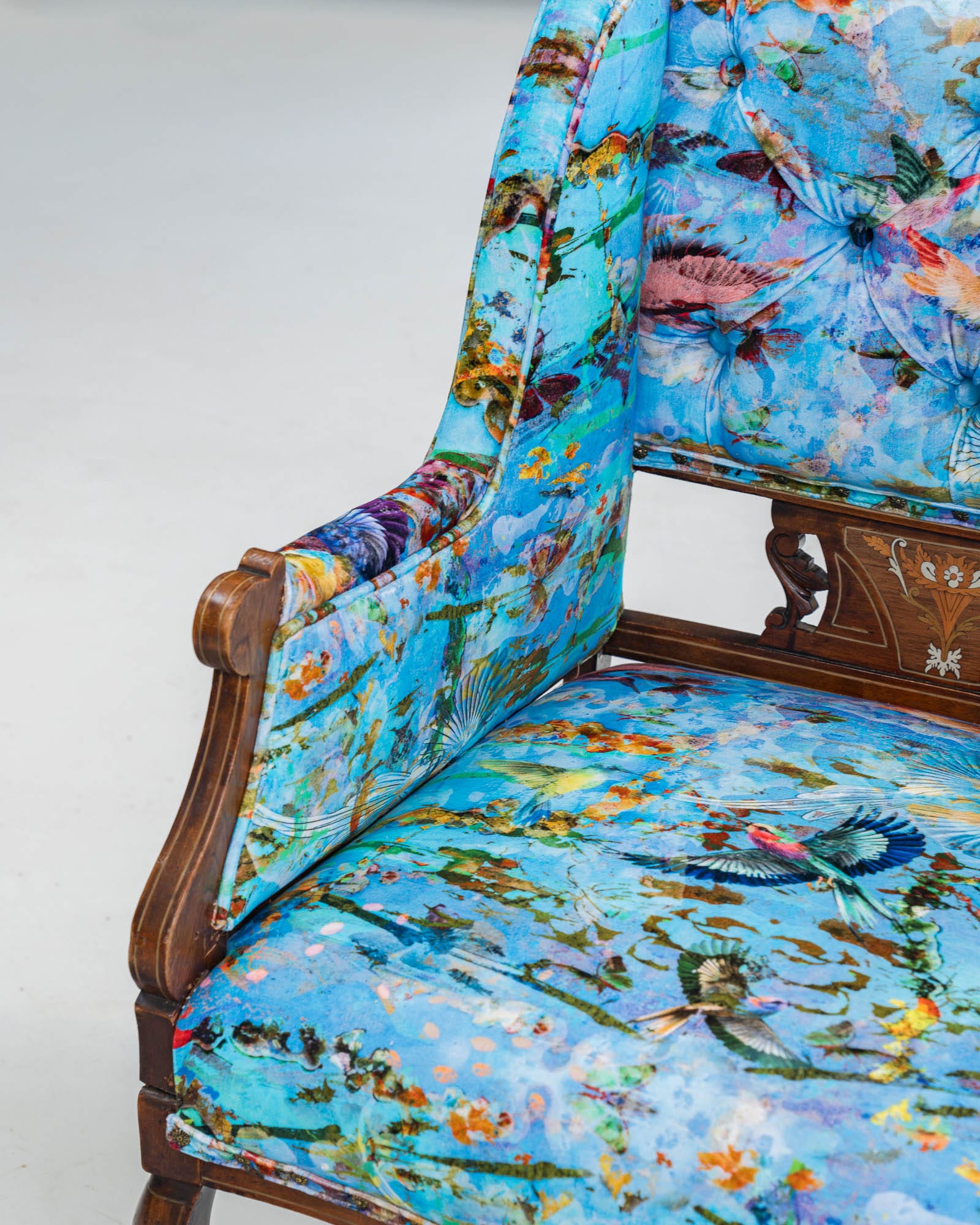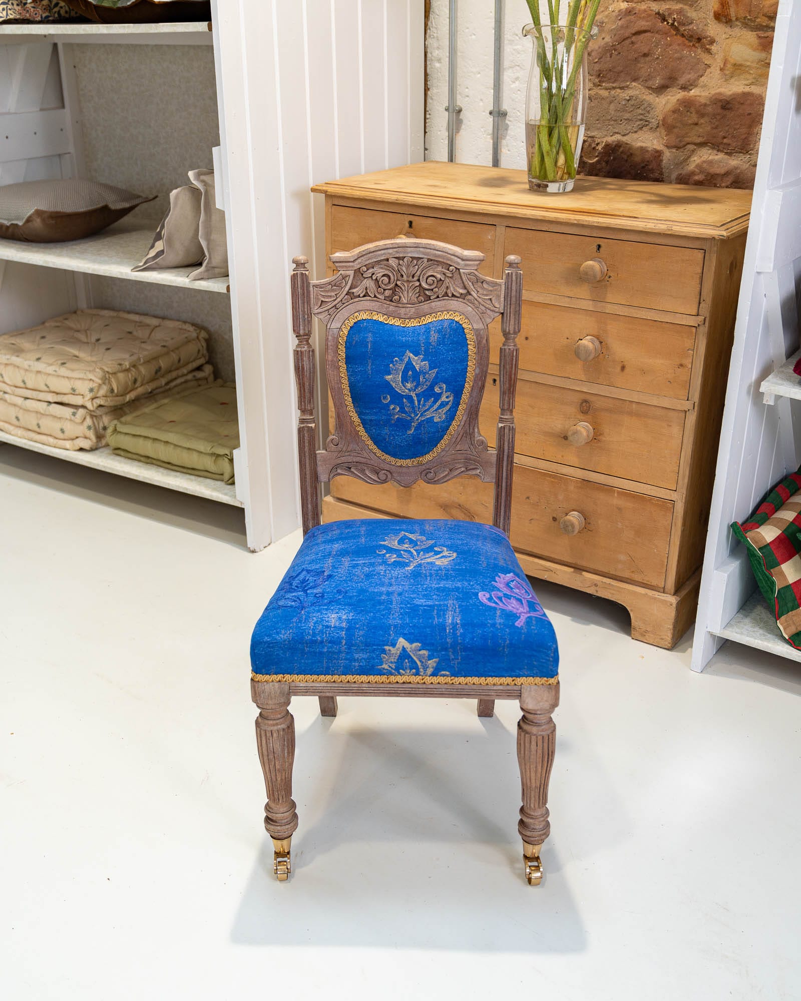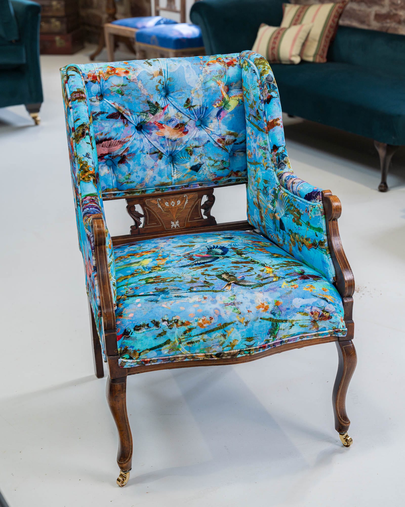 The Edwardian chair has been beautifully reupholstered in luxurious hummingbird velvet, blending classic craftsmanship with vibrant fabric for a unique and stylish finish.