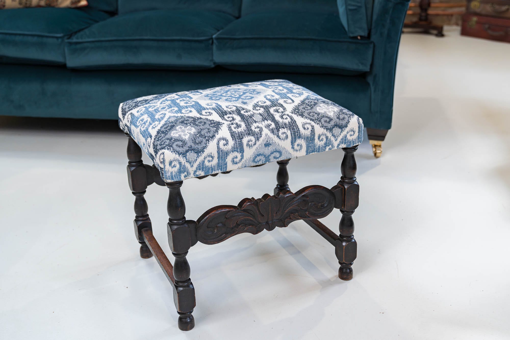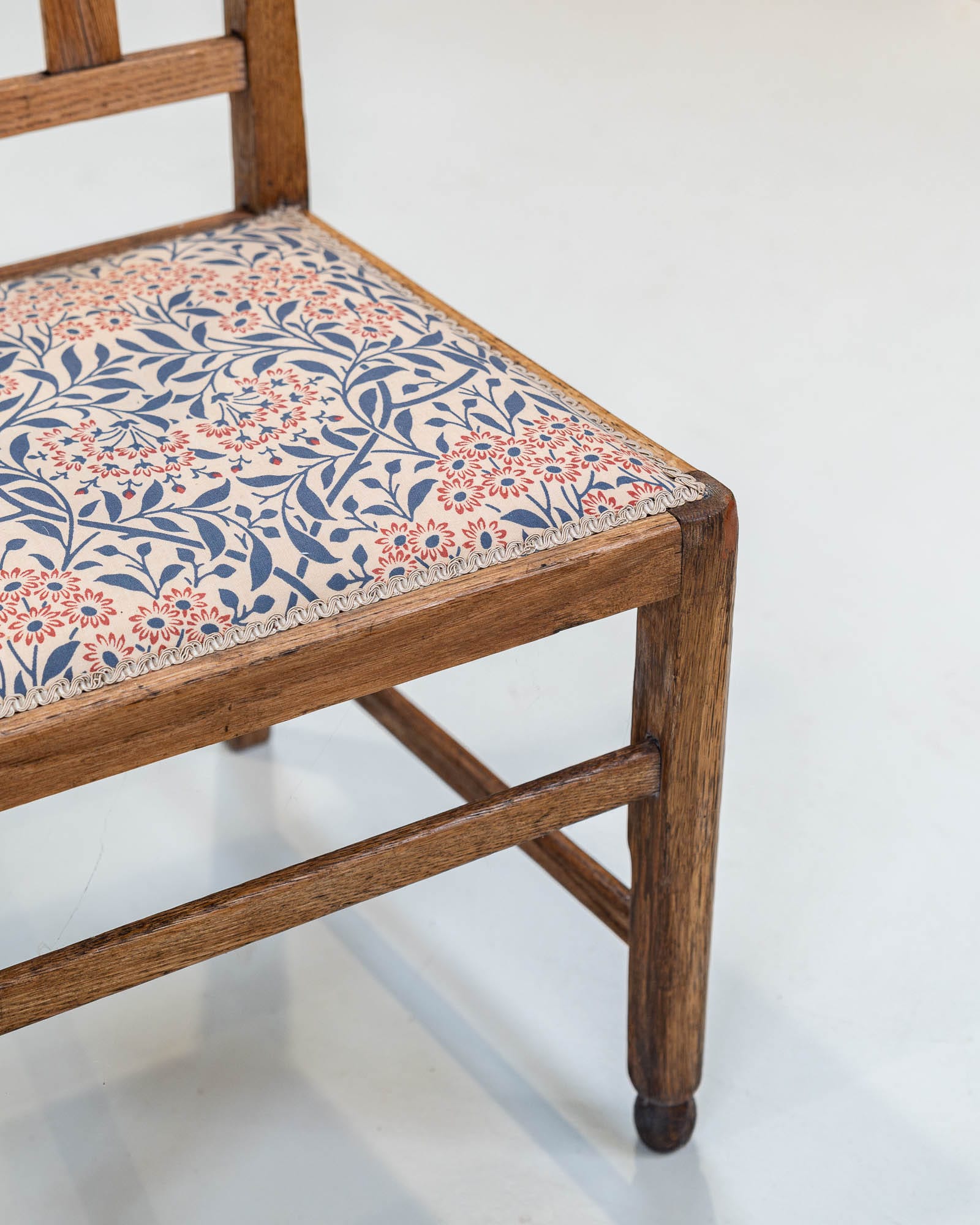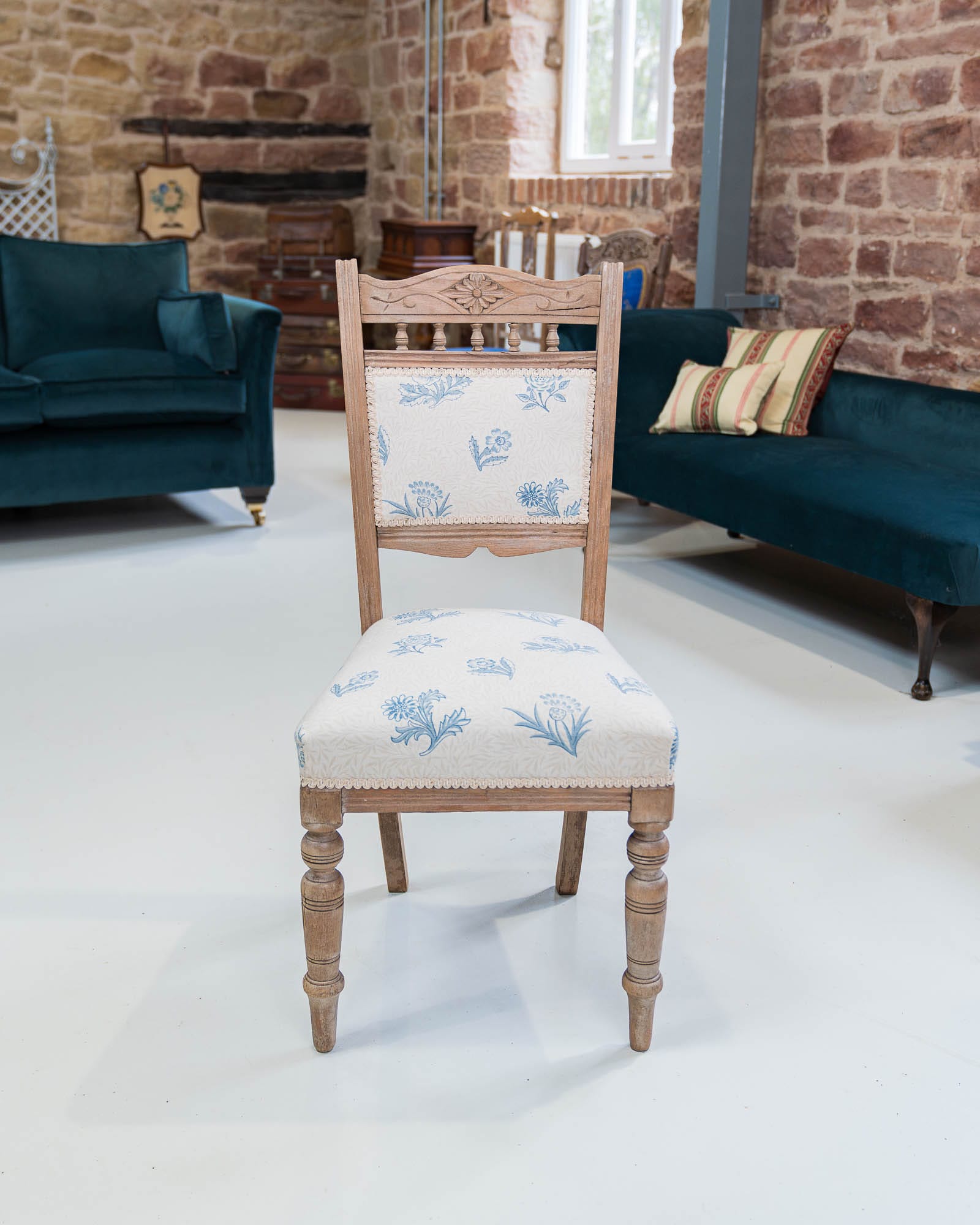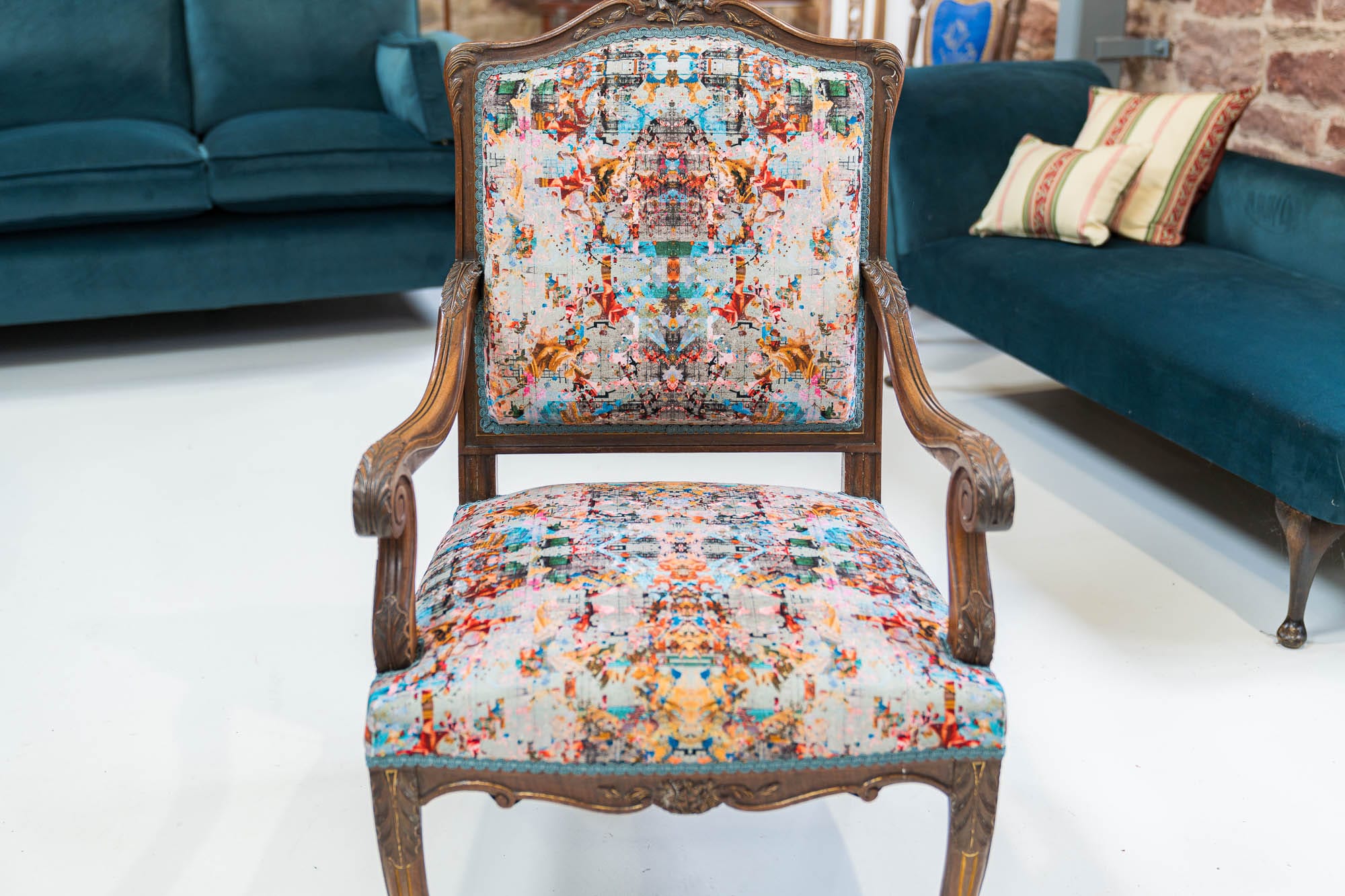 The Edwardian chair has been beautifully reupholstered in luxurious hummingbird velvet, blending classic craftsmanship with vibrant fabric for a unique and stylish finish.