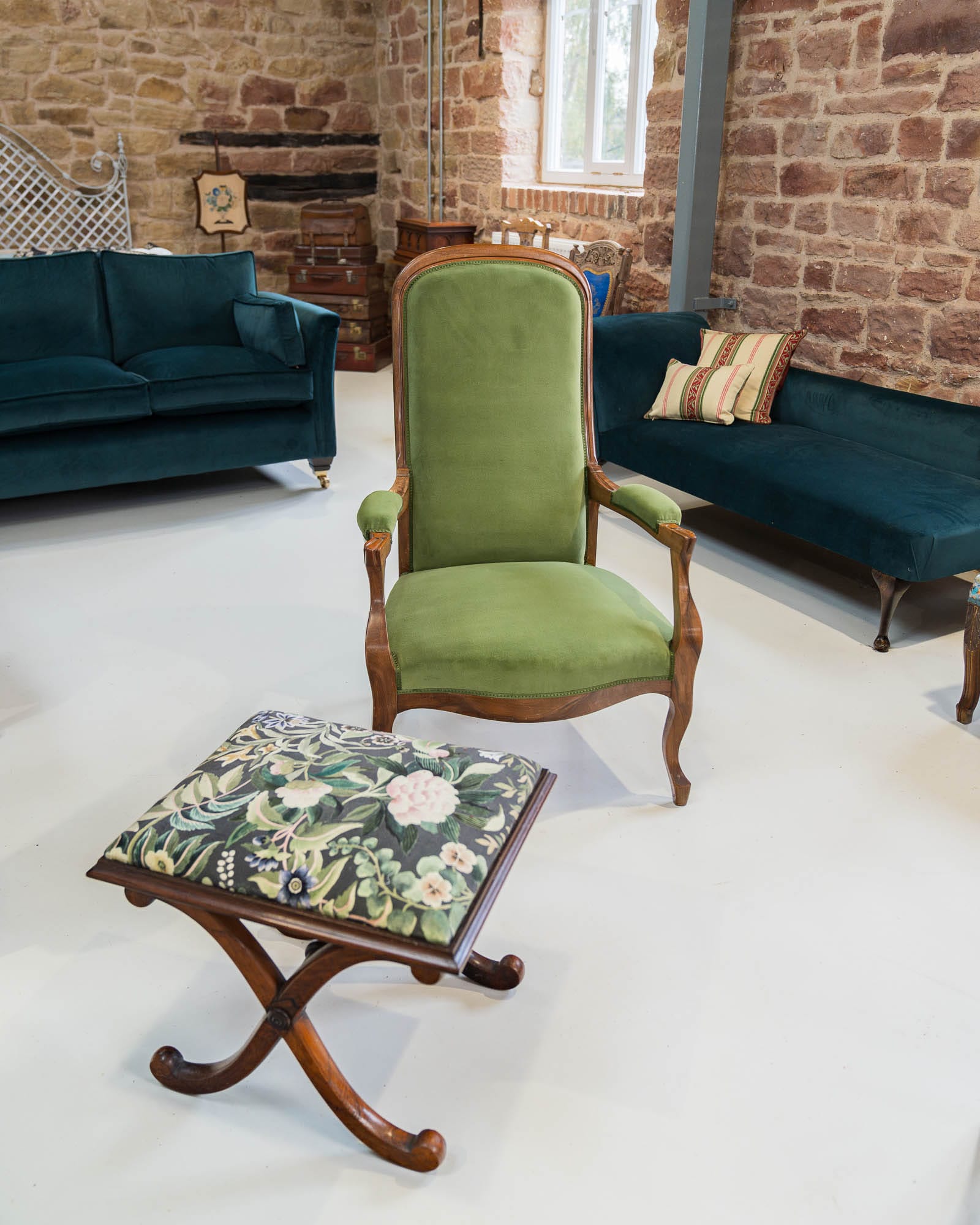 This French Voltaire chair, upholstered in vibrant velvet, serves as a true statement piece, combining bold colour with timeless style.