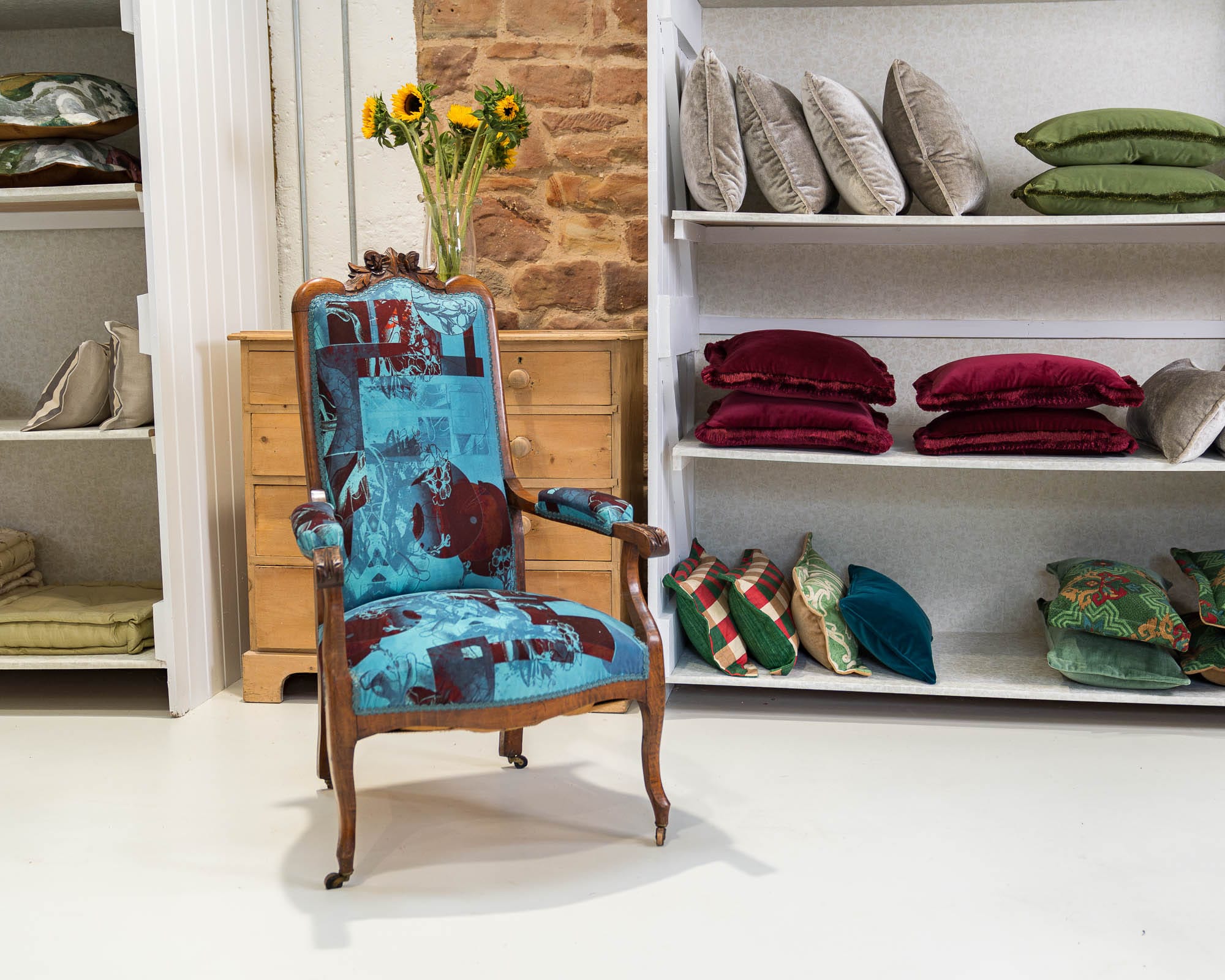 A classic English walnut lolling chair has received a fresh lease of life with raspberry velvet upholstery. In addition to the chair, a selection of raspberry velvet cushions are available in two different sizes, allowing for coordinated and comfortable interior accents.
